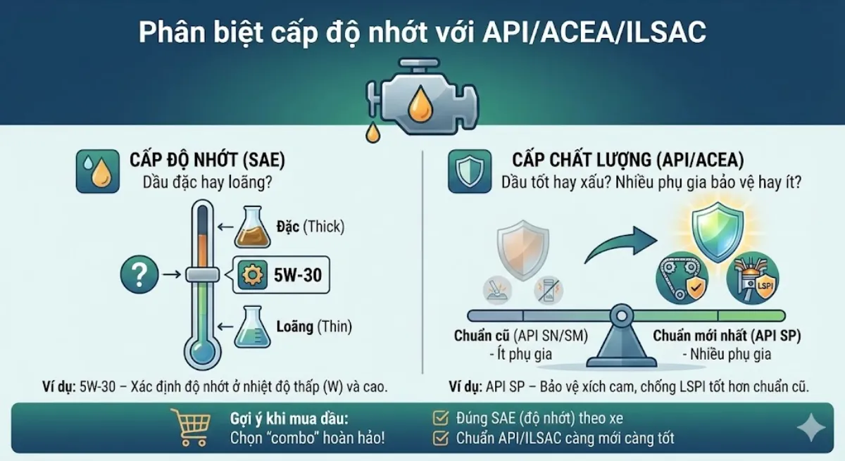 - Gợi ý: Khi mua dầu, hãy kiểm tra cả hai: Đúng SAE (độ nhớt) theo xe + Chuẩn API/ILSAC càng mới càng tốt.