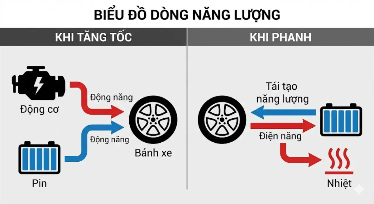 Khi giảm tốc/phanh, xe dùng phanh tái sinh để thu hồi năng lượng sạc lại pin (không hại pin). Lên dốc, xăng và điện cùng kéo giúp xe leo khỏe; đổ đèo, tái sinh vừa hãm xe vừa sạc pin, giảm tải cho phanh.