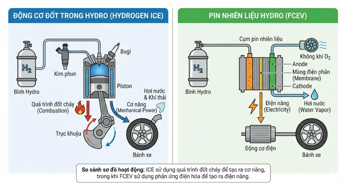 Nhiều người tìm kiếm động cơ hydro”thường nhầm lẫn, nhưng thực tế công nghệ này có hai hướng chính: đốt trực tiếp hydro trong buồng đốt hoặc dùng pin nhiên liệu tạo điện chạy xe.