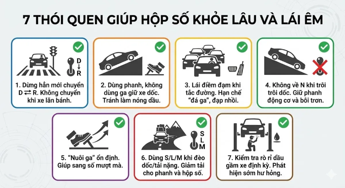 Đa phần lỗi người dùng đến từ thói quen: chuyển D-R khi xe chưa dừng, đạp ga mạnh liên tục, hoặc giữ xe dốc bằng ga. Sửa thói quen giúp bền hơn.