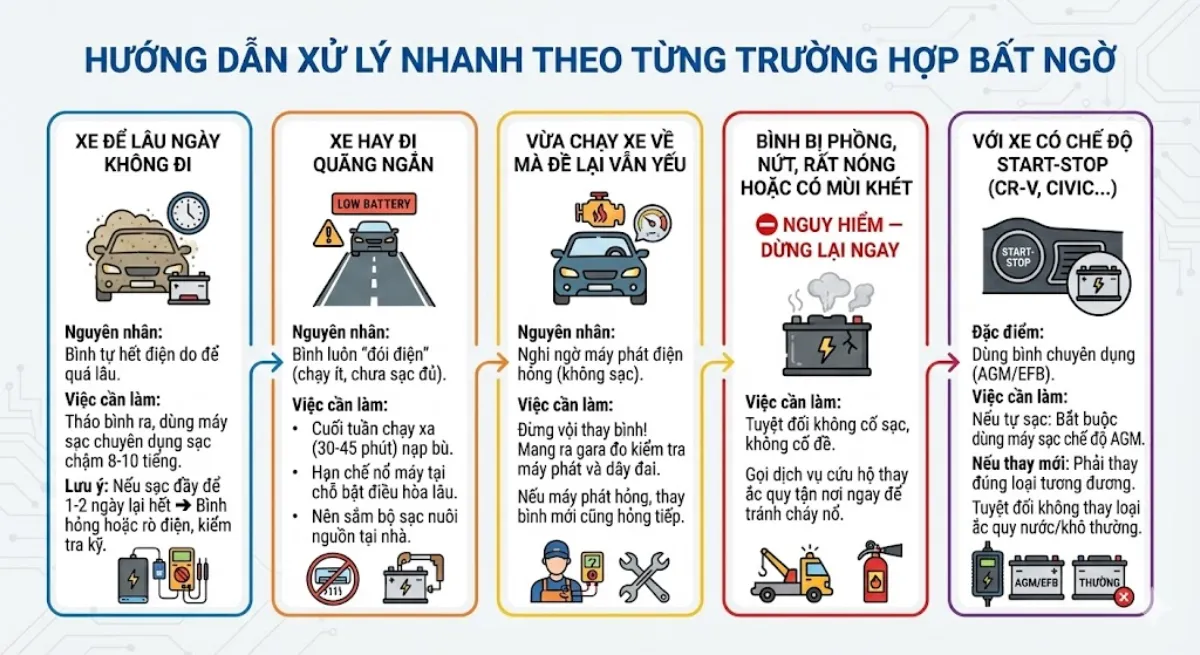 - Việc cần làm: Tuyệt đối không cố sạc, không cố đề. Gọi dịch vụ cứu hộ thay ắc quy tận nơi ngay lập tức để tránh nguy cơ cháy nổ.